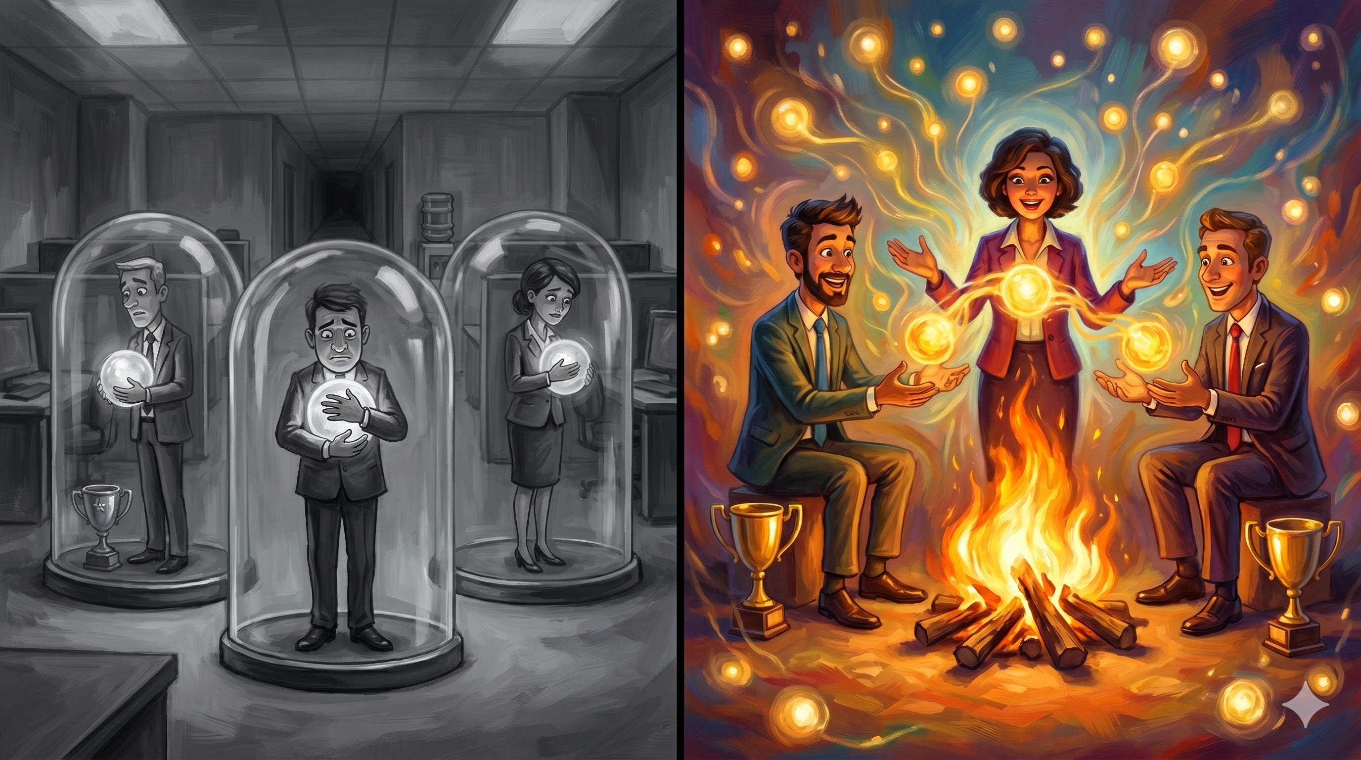 The orgs I’ve been part of that built genuine sharing cultures weren’t the ones with the best training programs. They were the ones where it was embarrassing not to share what you knew. Where teaching someone else didn’t make you less valuable — it made you more of one.